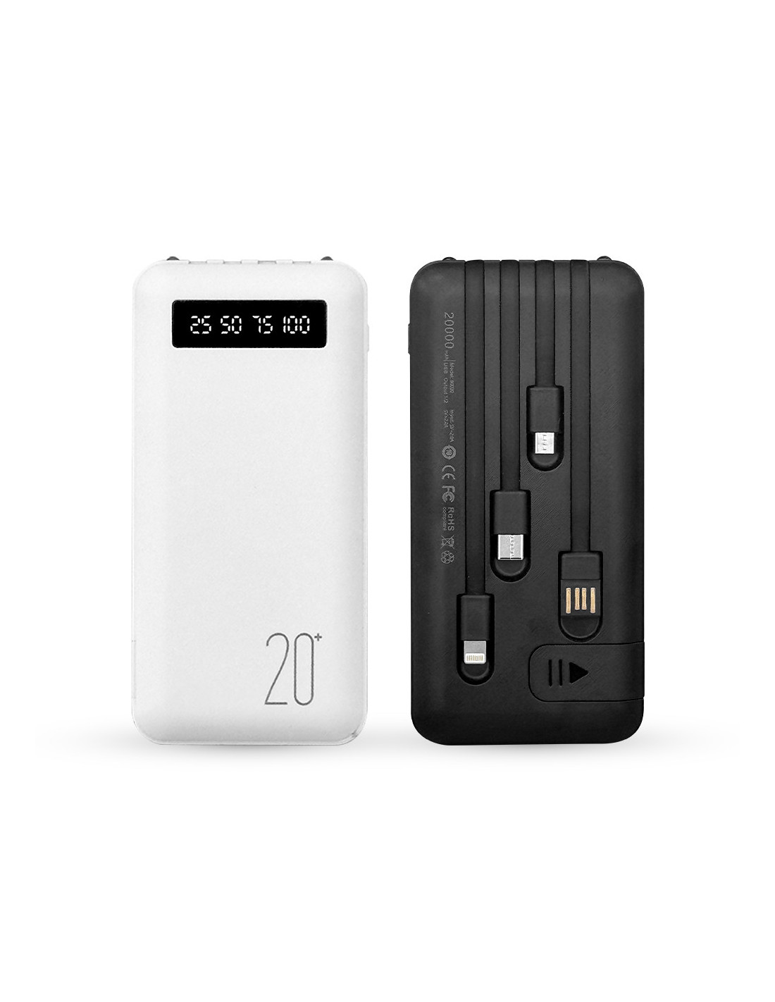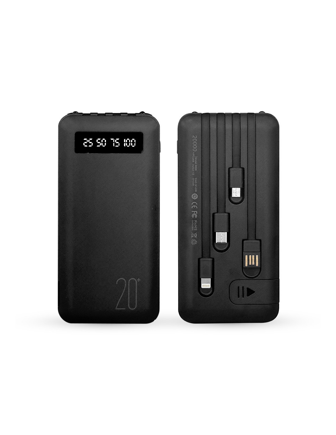 Power Bank 20000mAh con 4 cables USB integrados.