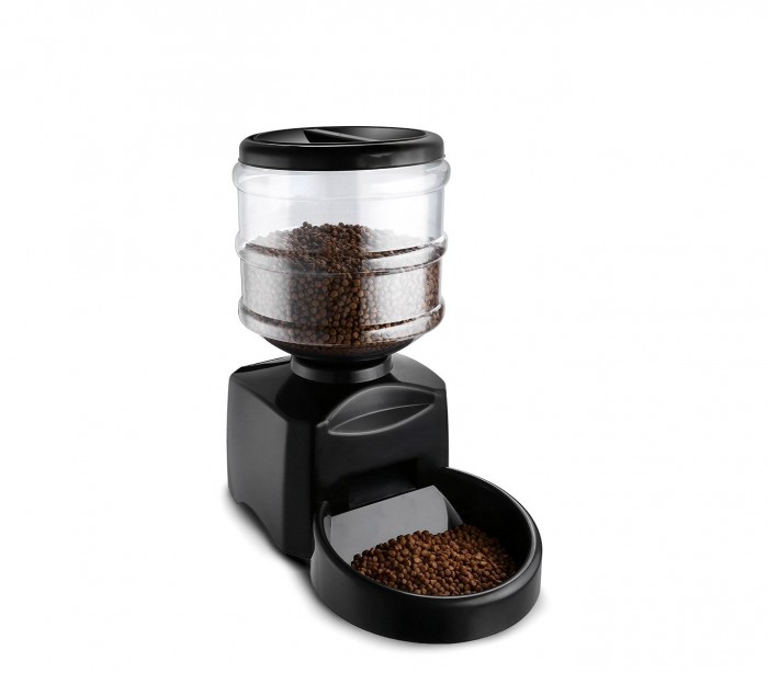 Este dispensador automático dispone de un deposito transparente que puede almacenar hasta 5,5 litros, independientemente de su tamaño, forma o tipo. Perfecto para aquellos que tienen que alejarse de su hogar, como viajar por trabajo, y no pueden llevar a su cachorro. Gracias a la gran pantalla LCD, puede ver el tiempo, las comidas programadas, el tamaño de la comida servida y las cantidades. Distribuye automáticamente porciones preestablecidas de comida para mascotas. También puede registrar su voz para permitir que su mascota se acerque al distribuidor a la hora de comer.