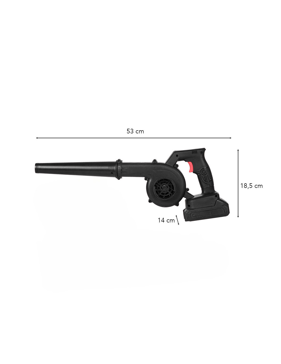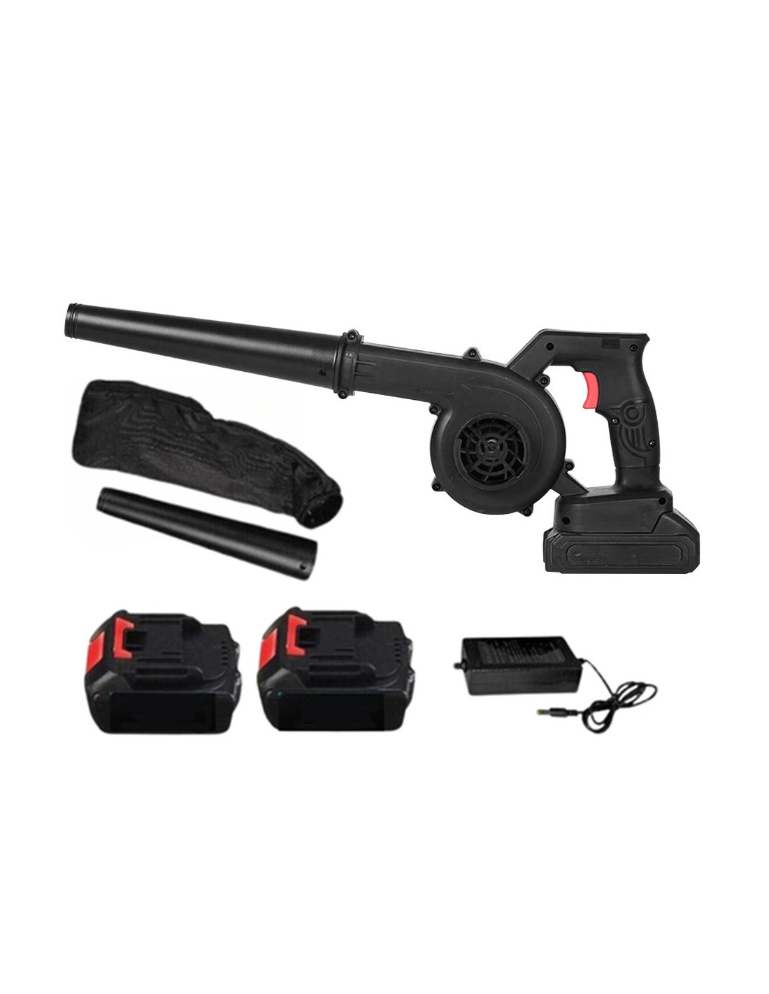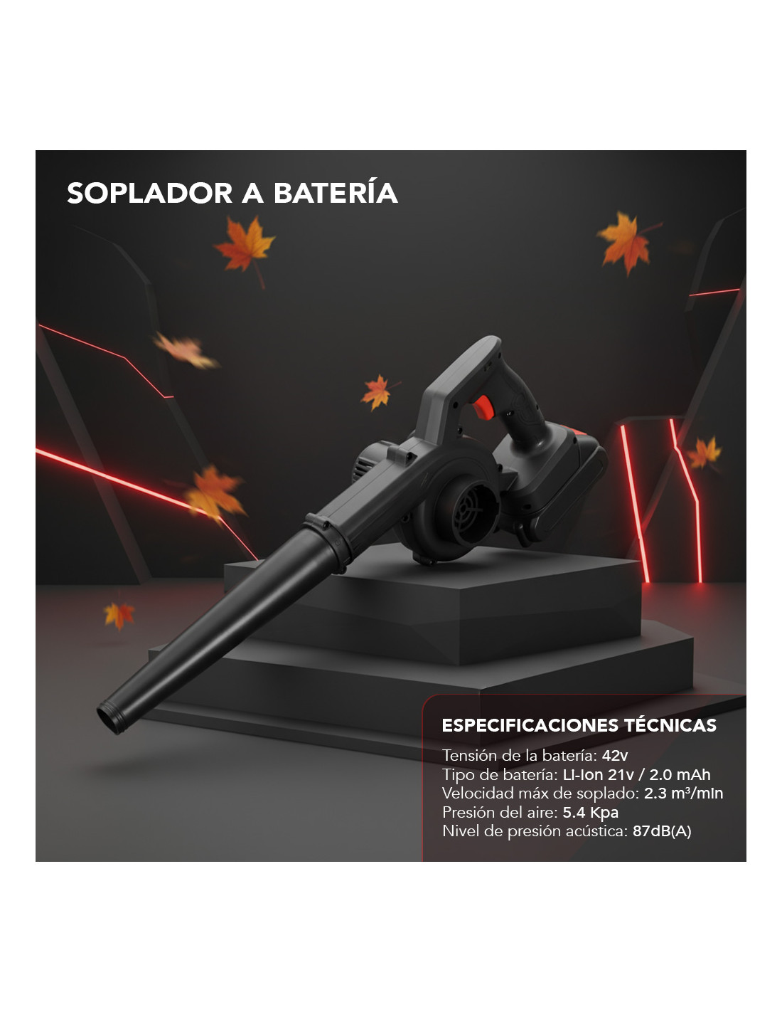 Contenido del paquete: 1 soplador, 1 tubo + bolsa de recolección, 2 baterías Li-Ion recargables, 1 cargador, manual de usuario