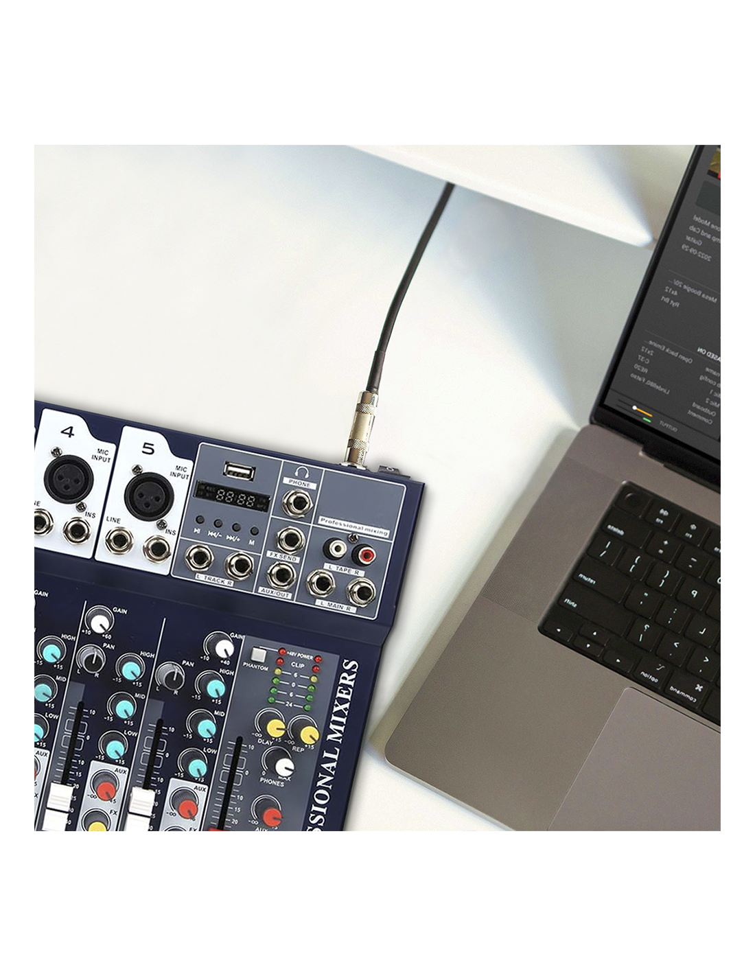 Explora las infinitas posibilidades musicales con nuestro mezclador de audio de 7 canales, diseñado para satisfacer las necesidades profesionales y de los aficionados. El diseño portátil, ideal para escritorios o desplazamientos, se combina con la potencia de sus características avanzadas. Gracias al sistema de conexión Bluetooth, puedes disfrutar de streaming musical sin cables directamente en la consola, ofreciendo una flexibilidad incomparable. Los canales mono cuentan con conectores XLR y jack, botones phantom +48V e indicador LED de pico de alta precisión para una calidad de audio superior. Conviértete en un DJ experto con la facilidad de amplificar la voz, ajustar el volumen y aplicar efectos a los sonidos. La función de reproductor de MP3 integrada, con conexión USB y controles dedicados, agrega un nivel único de versatilidad a tu set. Entra en el mundo del audio profesional con nuestro mezclador, donde cada detalle está diseñado para maximizar tu experiencia musical.