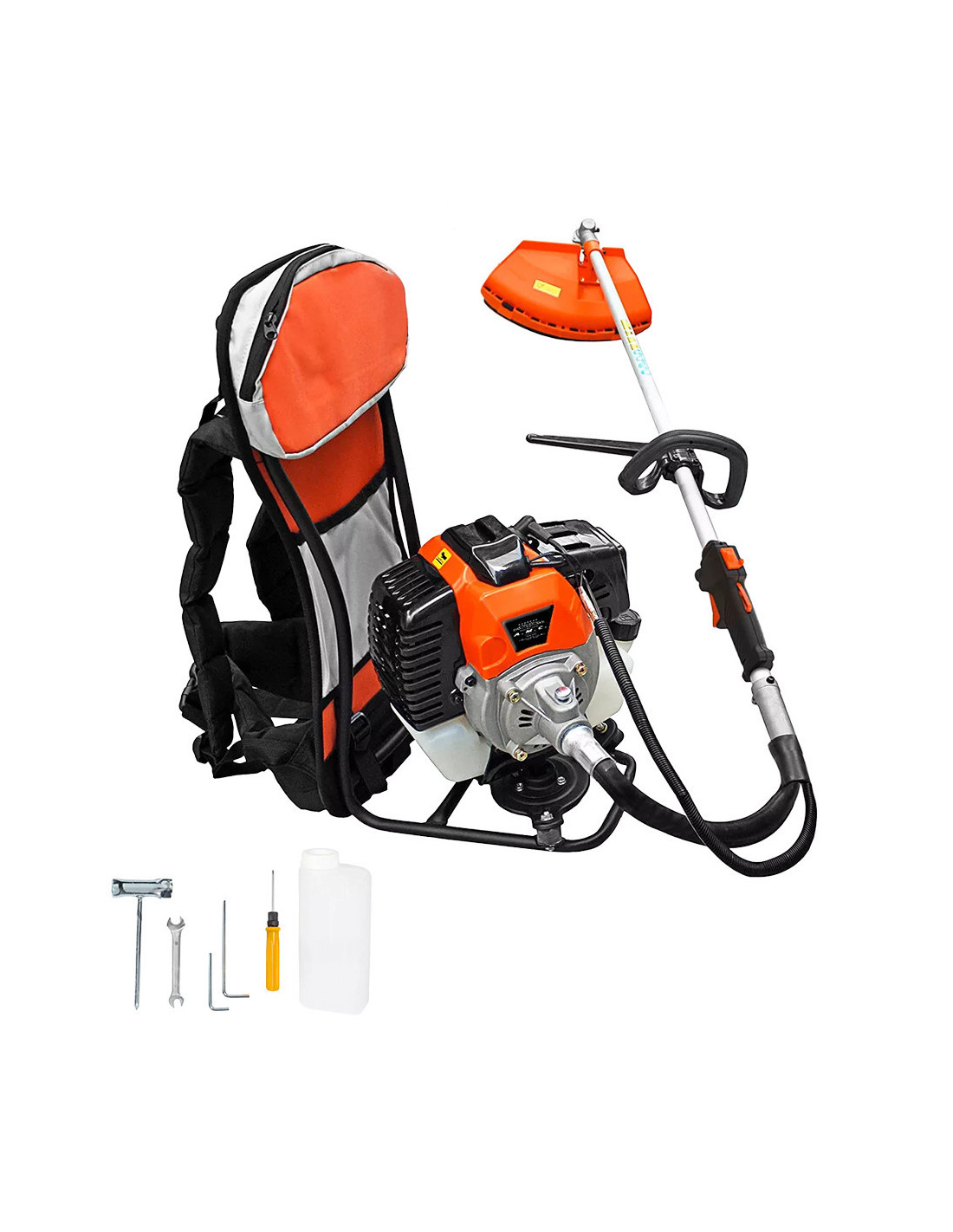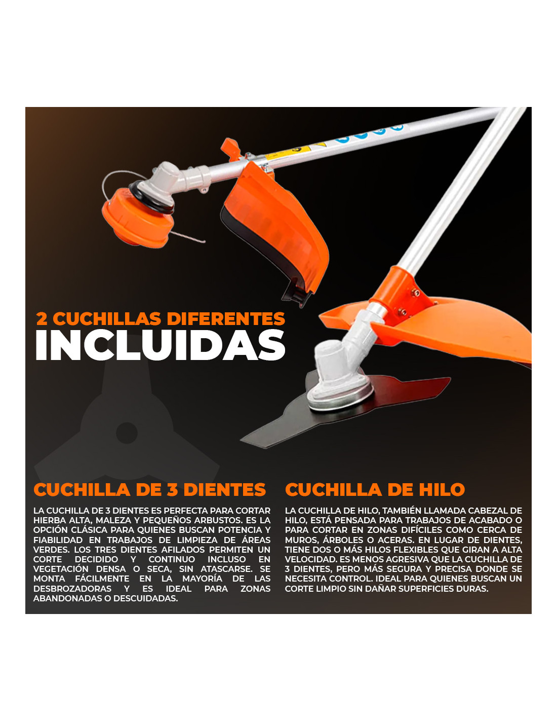 Equipamiento completo: cabezal de nailon, cuchilla de 3 dientes, kit de mantenimiento y botella para la mezcla.