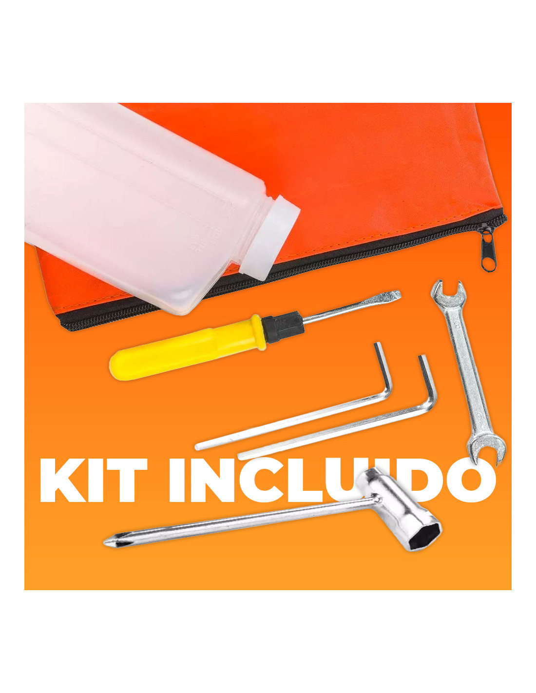 Kit de llaves de mantenimiento y botella para la mezcla incluidos para un uso inmediato.