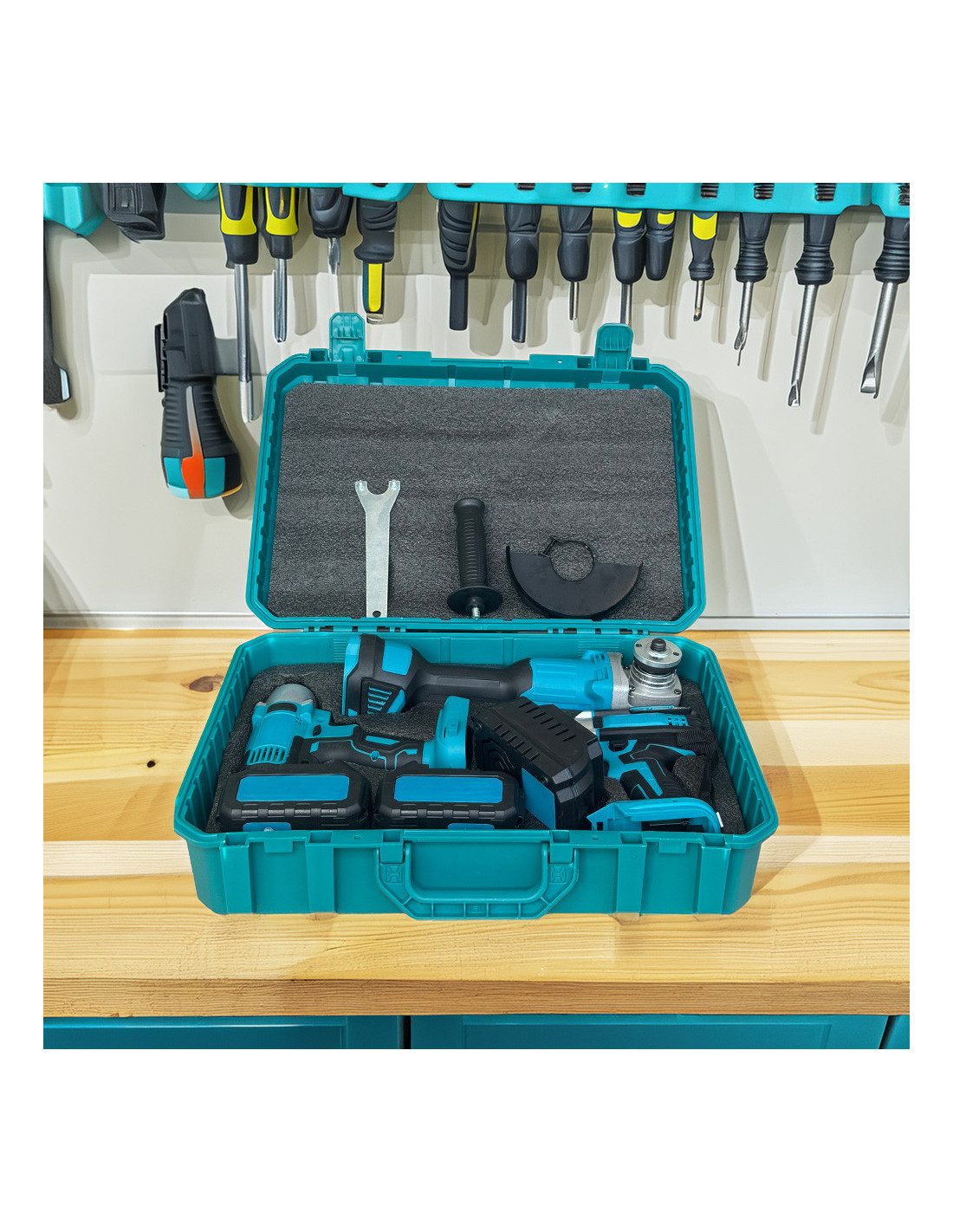 Kit Atornillador Taladro Amoladora Inalámbrica Doble Batería 72V con Maletín