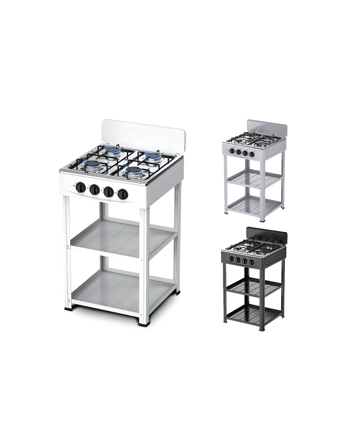 La superficie de cocción cuenta con cuatro quemadores independientes, perfectos para gestionar diferentes preparaciones al mismo tiempo: 1 quemador de 2 kW para cocciones más rápidas, 2 quemadores de 1,5 kW para un uso versátil y 1 quemador de 1,1 kW para cocciones lentas o salsas delicadas. Cada fuego se controla mediante mandos ergonómicos, para una regulación de la llama práctica e inmediata. La estructura está hecha de aleación de aluminio resistente, pensada para durar en el tiempo incluso con un uso diario. Las parrillas superiores son extraíbles y lavables, garantizando facilidad de limpieza e higiene después de cada uso. Los estantes integrados añaden un toque de practicidad, reduciendo el desorden y aumentando el espacio útil.