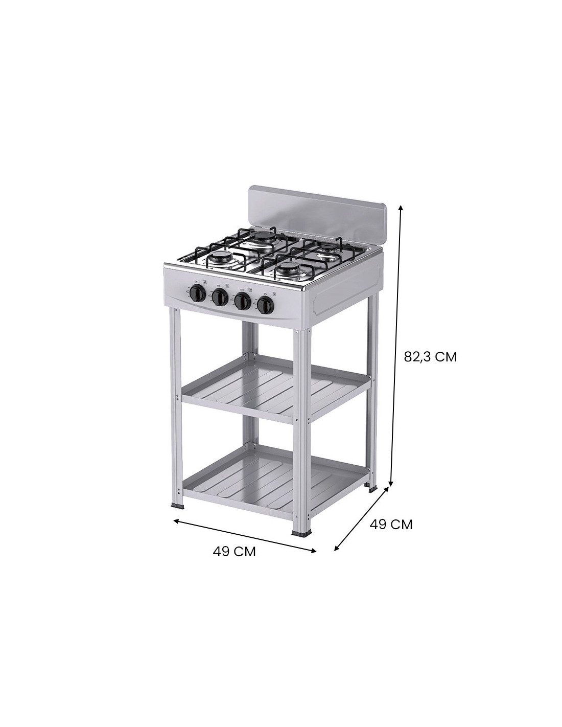 Lleva a tu cocina o a tus espacios exteriores un aliado práctico y fiable para cocinar cada día con eficiencia. Esta cocina de gas está diseñada para ofrecer la máxima comodidad gracias a su estructura compacta pero espaciosa, completa con dos amplios estantes de acero, ideales para tener siempre a mano ollas, utensilios o ingredientes.
