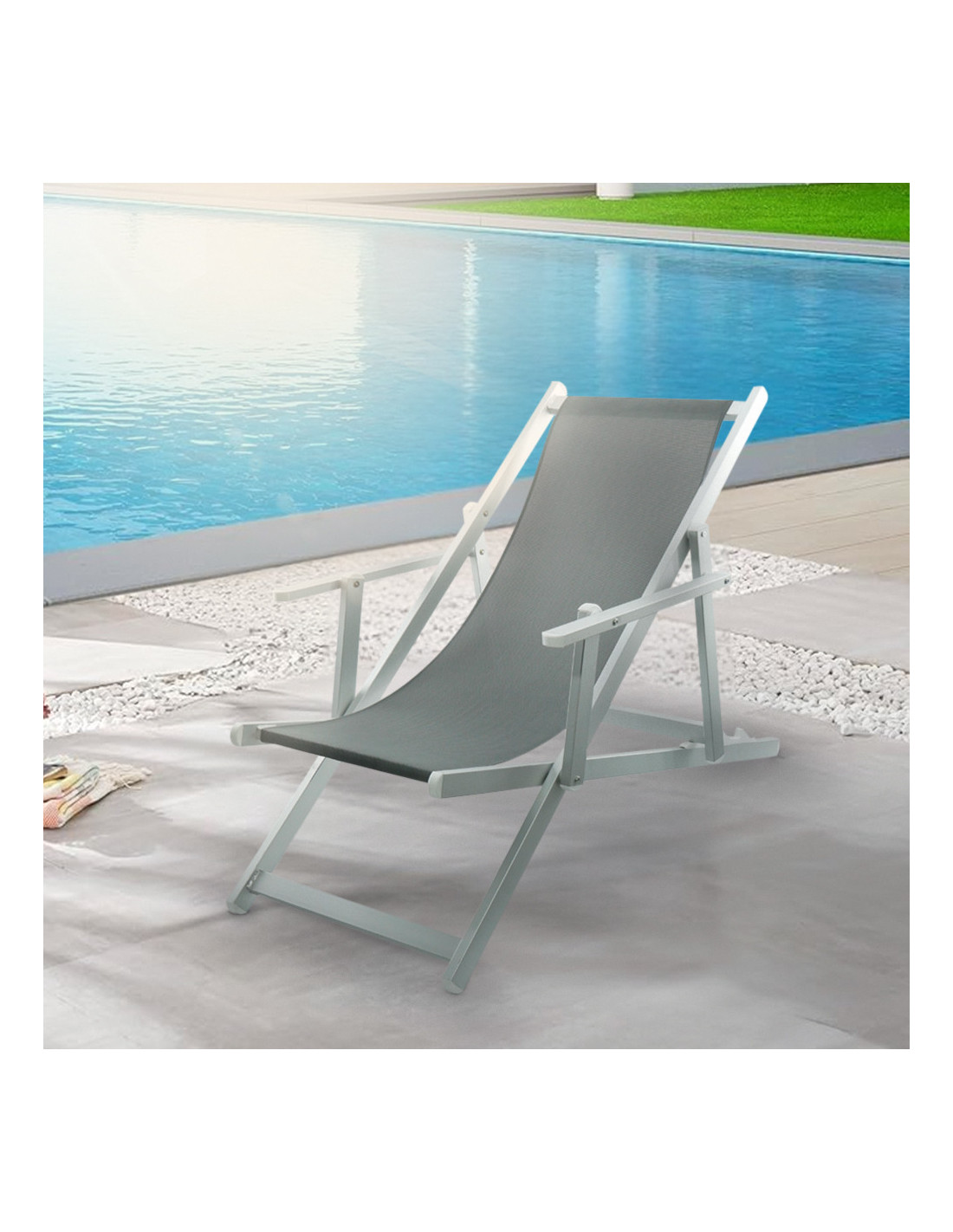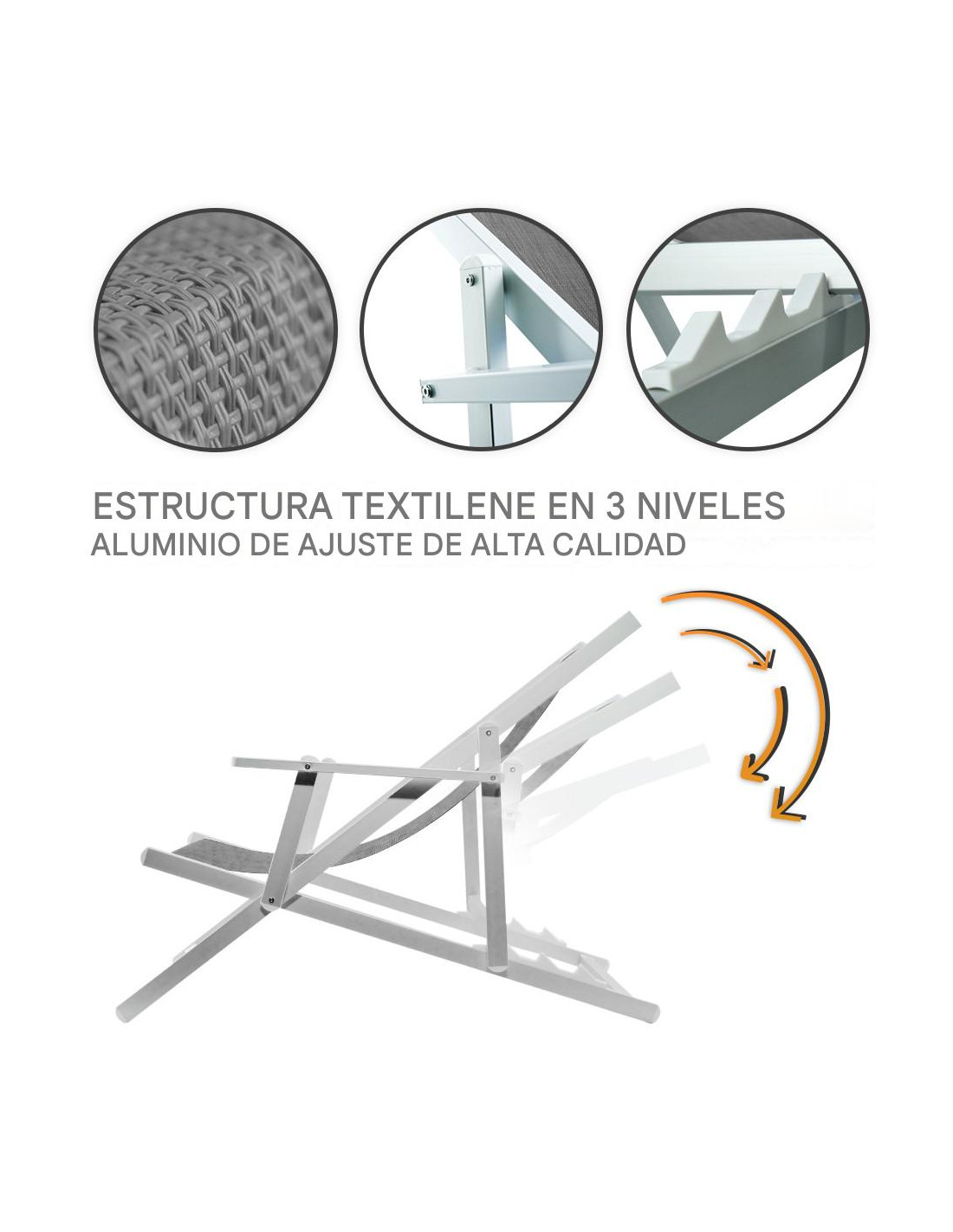El tejido textilene transpirable, antidesgarro y resistente a los rayos UV, asegura una experiencia de asiento cómoda y de larga duración. Además, los reposabrazos ergonómicos, que pueden ajustarse según la posición deseada, añaden un extra de confort, haciendo que tus momentos de relax sean aún más placenteros.