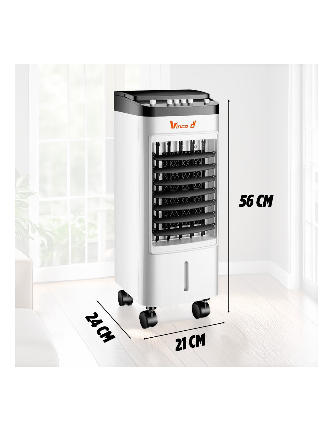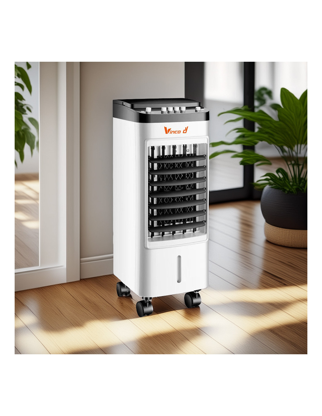 El depósito de 5.5 litros asegura un funcionamiento prolongado sin recargas frecuentes, mientras que las 6 cajas de hielo incluidas potencian el efecto de enfriamiento. Compacto y equipado con ruedas giratorias, es fácil de mover y colocar en cualquier ambiente de la casa o de la oficina.