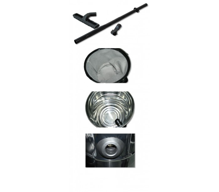 Papelera aspiradora para sólidos y líquidos a 30 litros, incluye un filtro que actúa como una bolsa reutilizable, simplemente vaciado y limpiado, posiblemente con un chorro de aire.