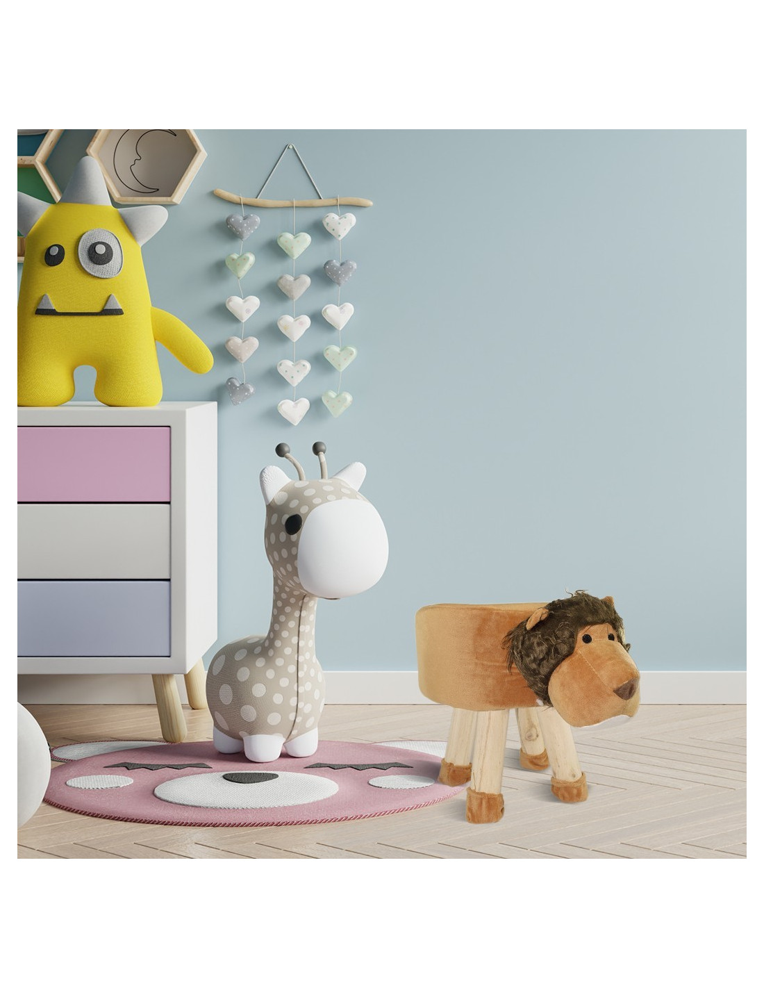 El puf blandito con forma de animal se convertirá en el compañero de juegos de tu hijo. Su suave forro de felpa y la linda cabecita de un animal estimularán a tu hijo, animándolo a jugar y sentarse en él. Pero este asiento acolchado no es solo un accesorio divertido, combina un asiento cómodo, un estante práctico y una decoración encantadora para el dormitorio en una sola solución. Este bonito puf consigue tener una capacidad máxima de 100Kg.