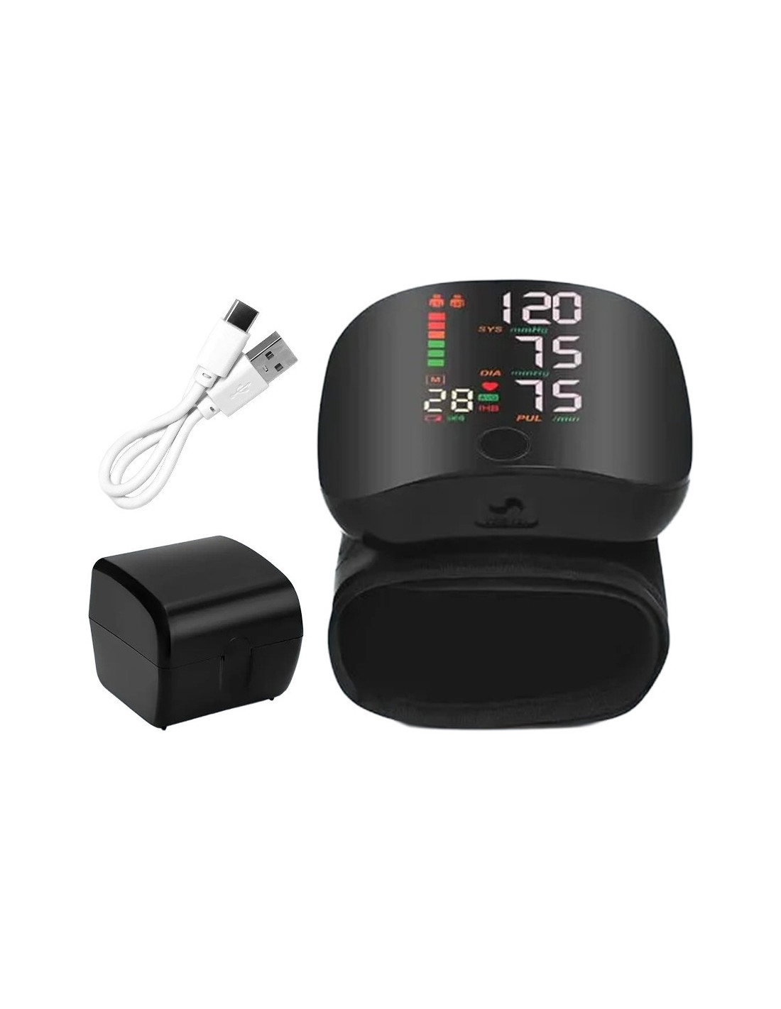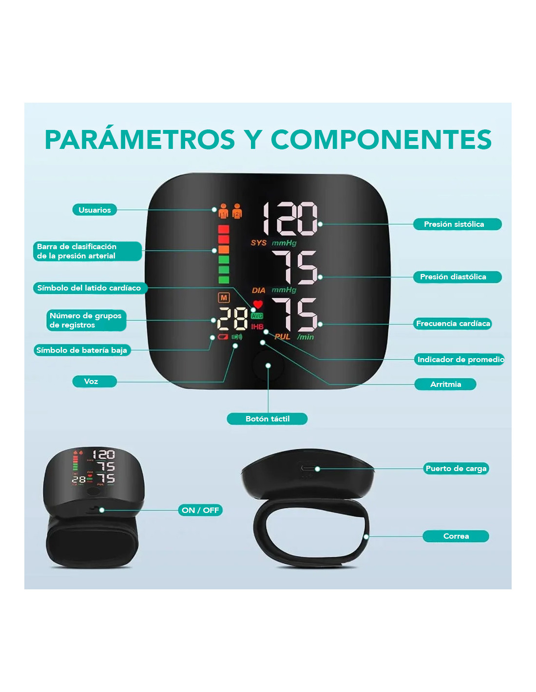Contenido del paquete: esfigmomanómetro de muñeca, brazalete, cable Type-C, manual, funda portátil