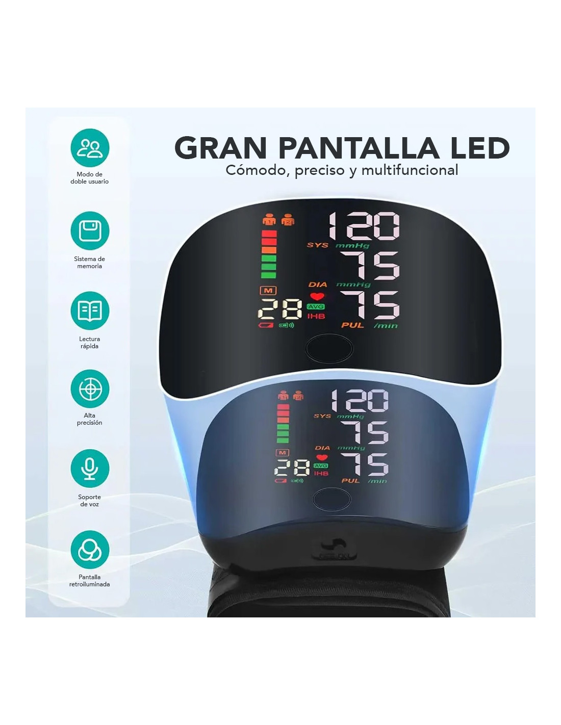El dispositivo cuenta con transmisión vocal en inglés, proporcionando indicaciones claras de los valores medidos, y con una amplia pantalla LED retroiluminada, fácil de leer incluso en entornos oscuros, perfecta para personas mayores o con problemas de visión.