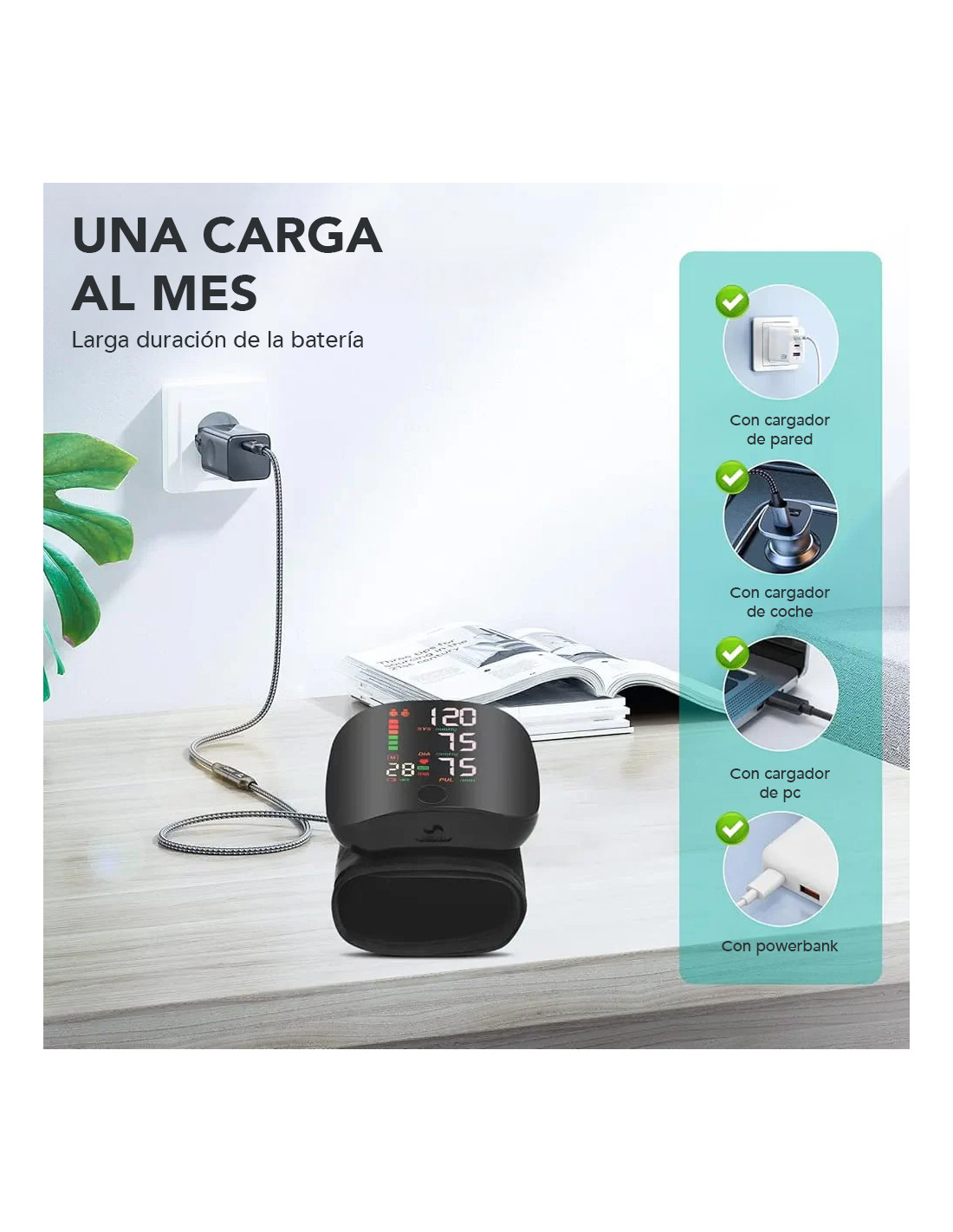 Portátil y recargable, el dispositivo incorpora una batería de litio integrada de 320 mAh, recargable mediante cable Type-C, que permite hasta 200 mediciones con solo dos horas de carga. Gracias a sus dimensiones compactas (75 × 68 × 30 mm) y a la funda incluida, es ideal también para quienes viajan con frecuencia.