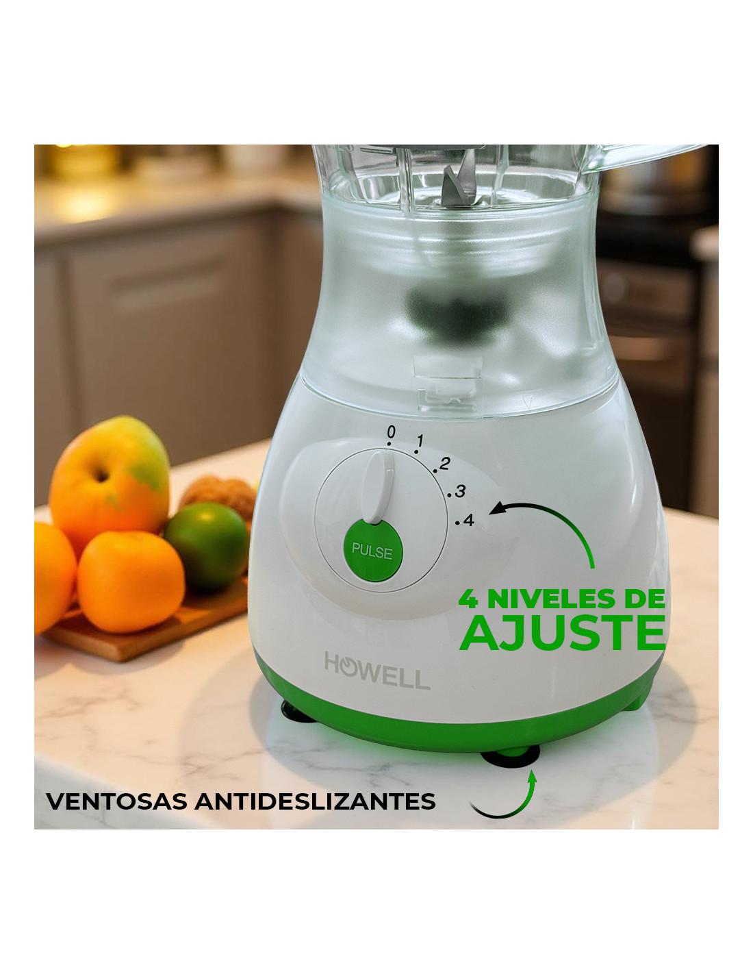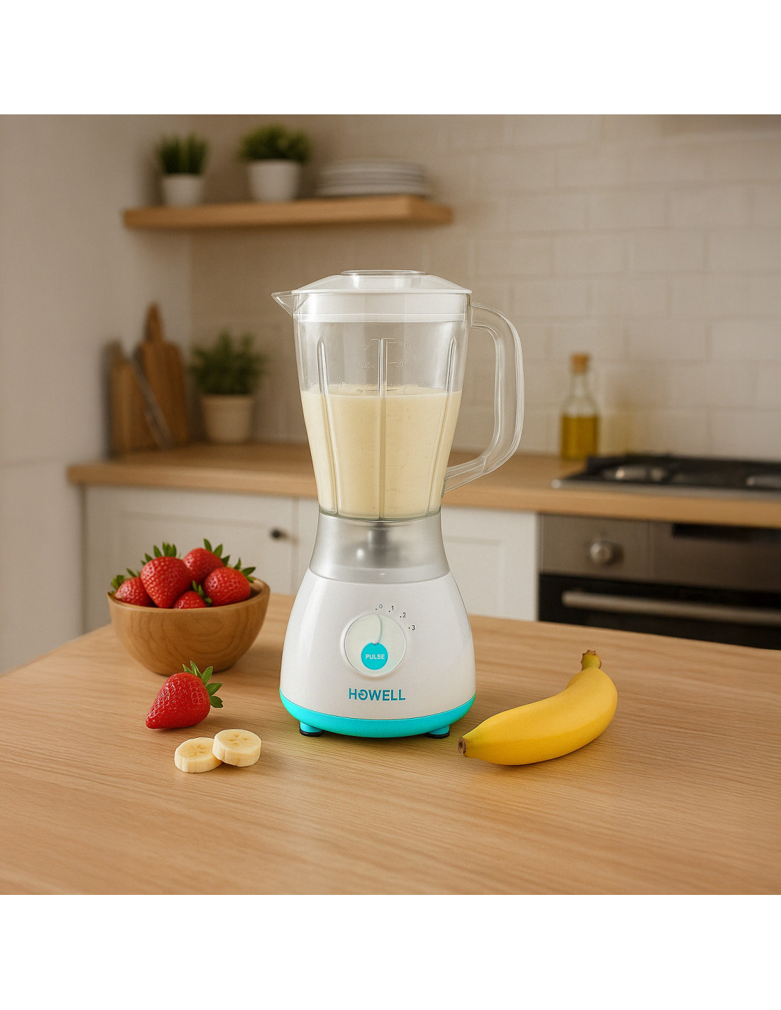 Licuadora Howell de 350 W, diseñada para garantizar un rendimiento fiable y versatilidad en la cocina, ideal para la preparación diaria de batidos, cremas, salsas y mezclas de diversos tipos.