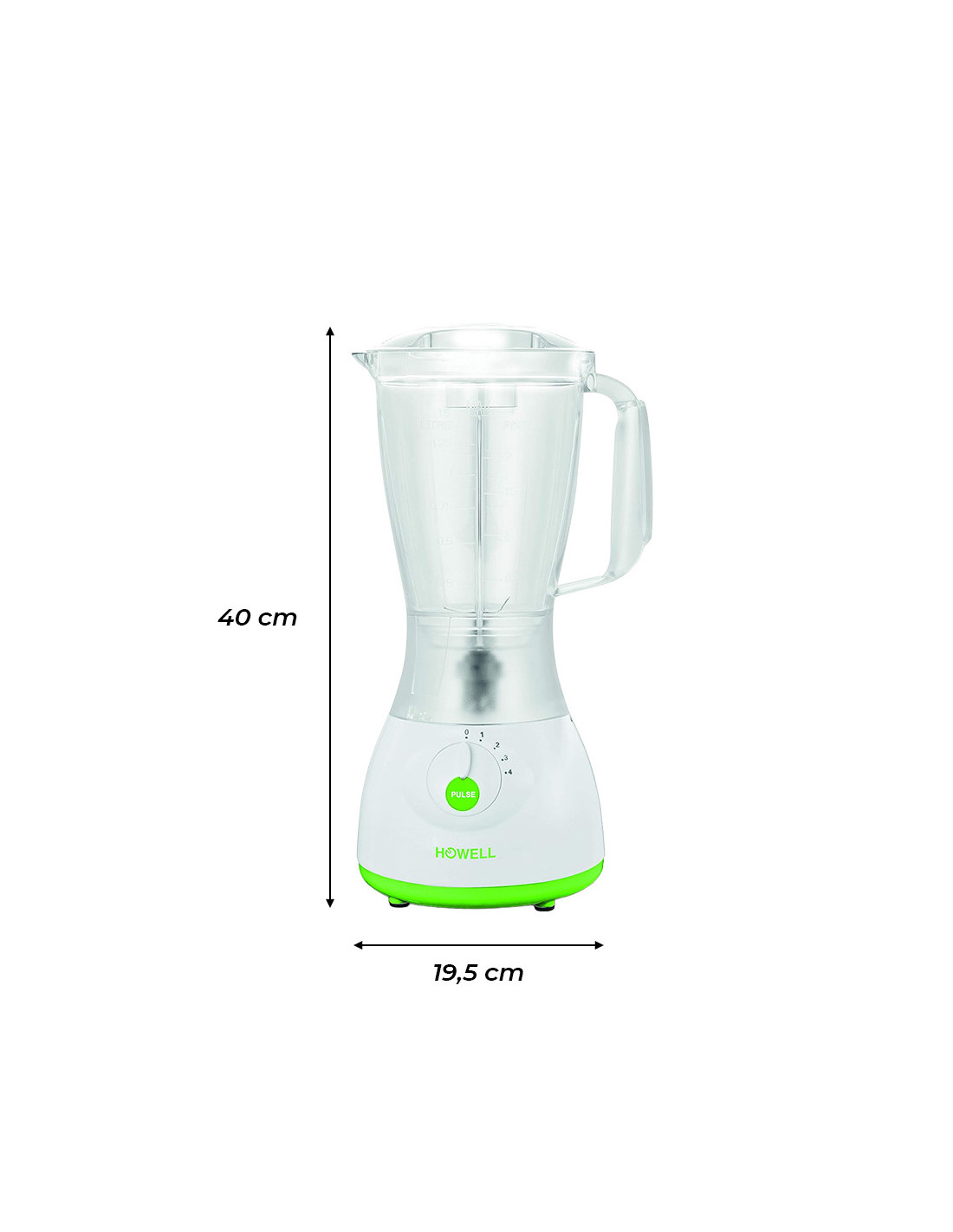 Licuadora Howell Potencia: 350W Jarra: Graduada de Plástico Capacidad: 1.5 litros Cuchillas: Acero Inoxidable Velocidades: 4 Ajustables Funciones: Pulse Limpieza: Fácil de Desmontar y Lavar Seguridad: Bloqueo de Seguridad Estabilidad: Pies Antideslizantes Dimensiones: 40x19.5 cm