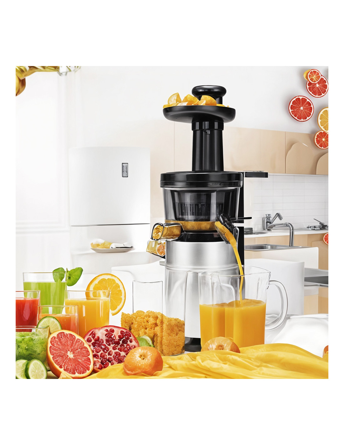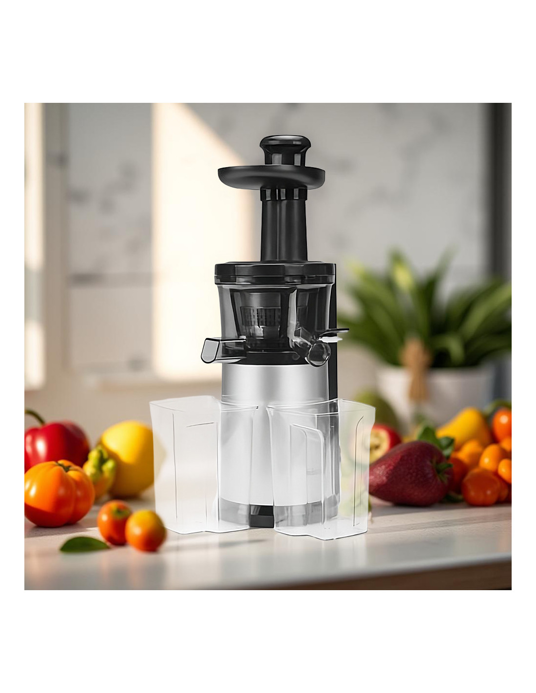 - Separación automática: Dos contenedores separados para pulpa y zumo/jugo, máximo rendimiento sin desperdicio.