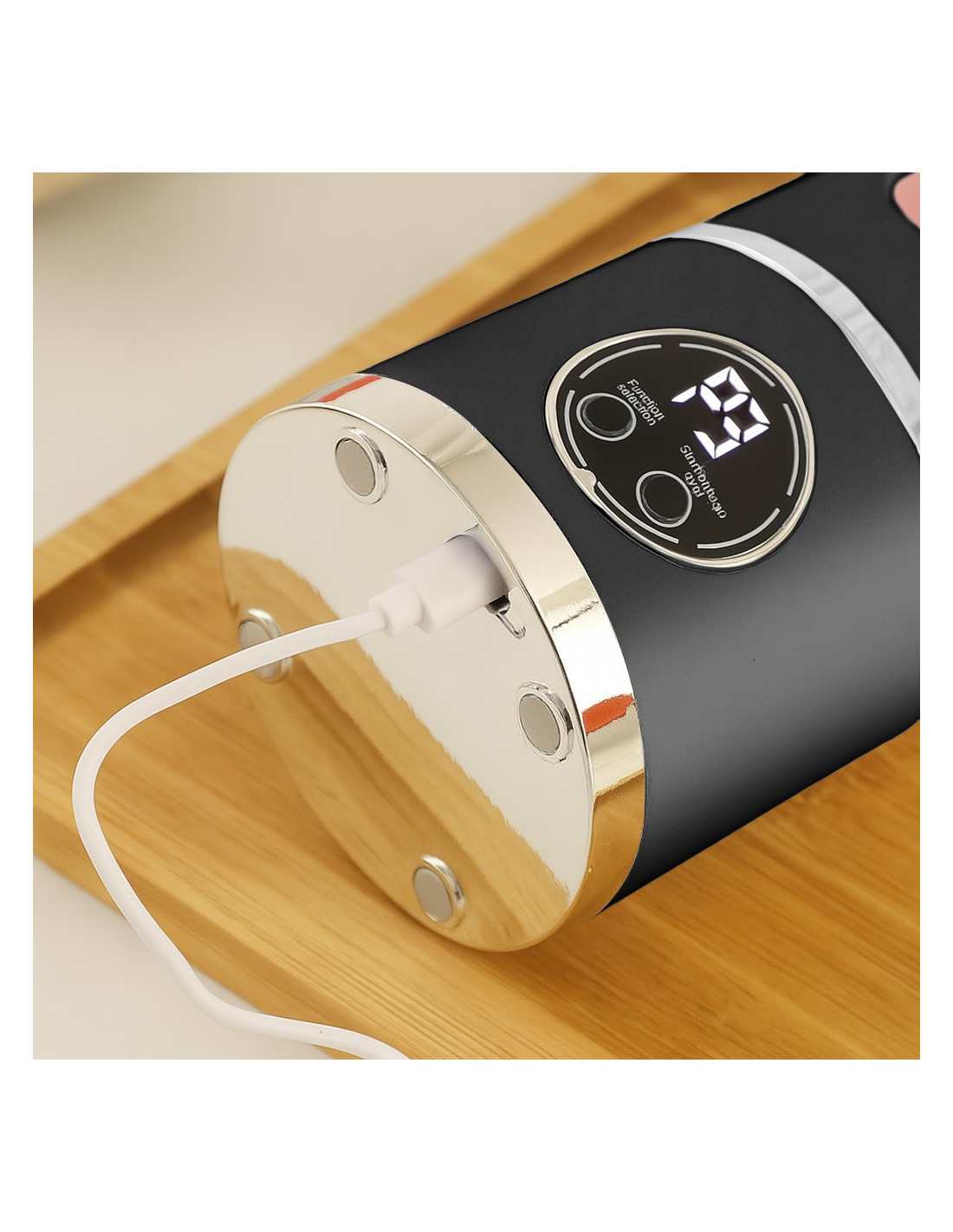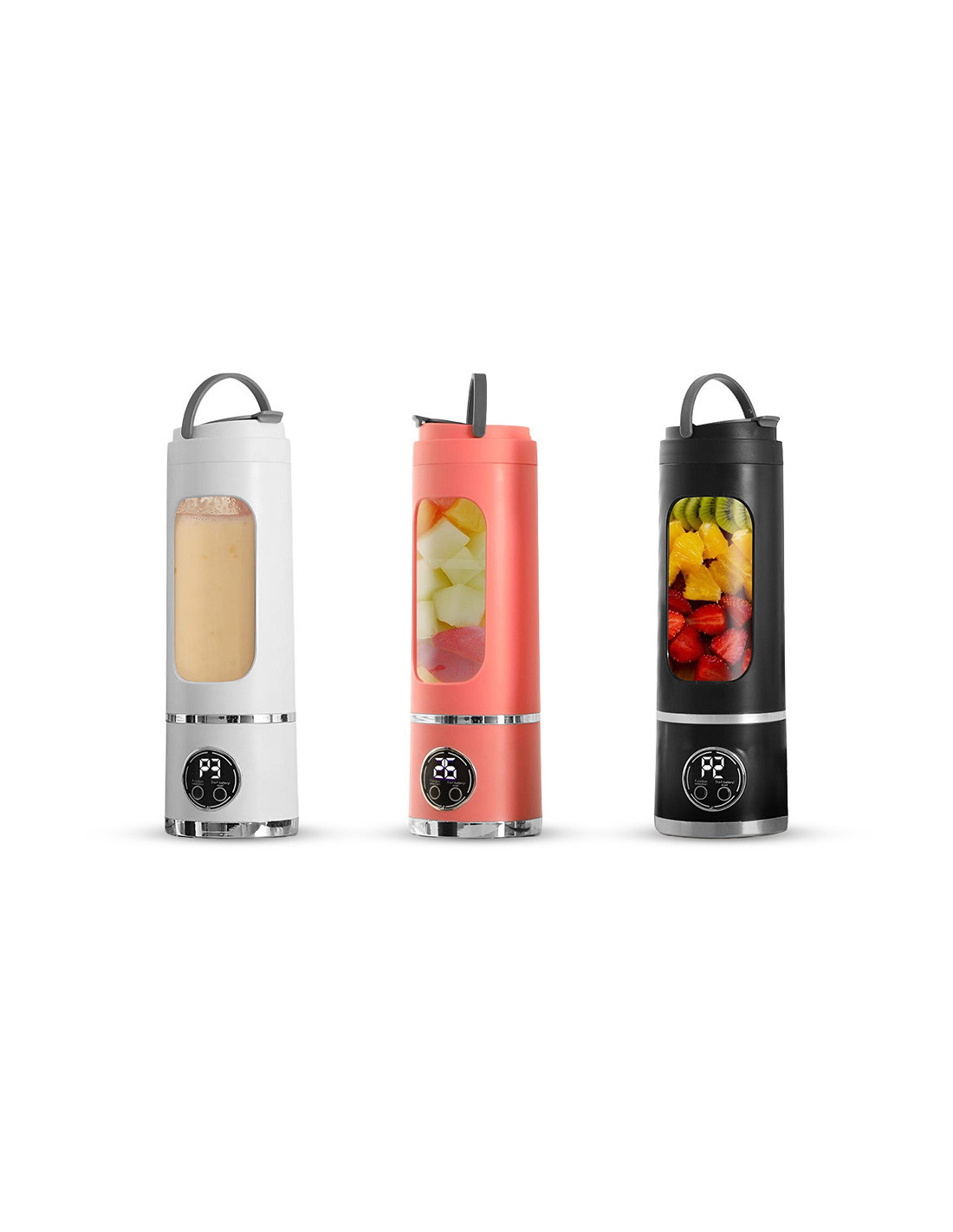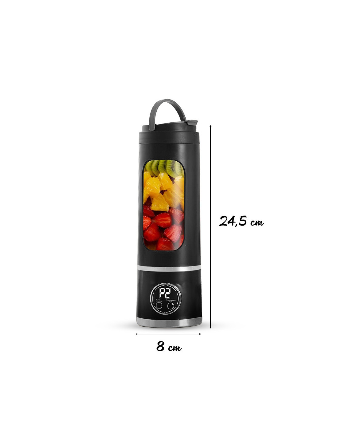 Equipada con una batería integrada recargable vía USB, permite preparar batidos, smoothies, bebidas proteicas o zumos frescos en pocos segundos, sin necesidad de una toma de corriente. La pantalla digital LED permite un uso intuitivo y preciso, mientras que las cuchillas de acero inoxidable garantizan una mezcla uniforme y eficaz.