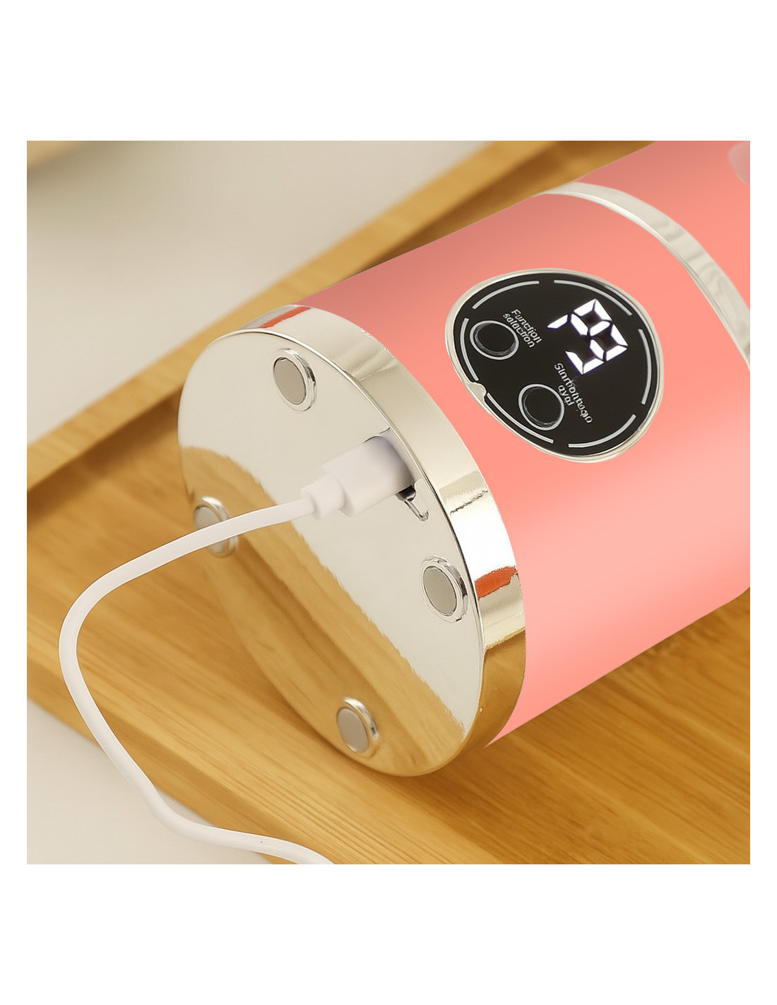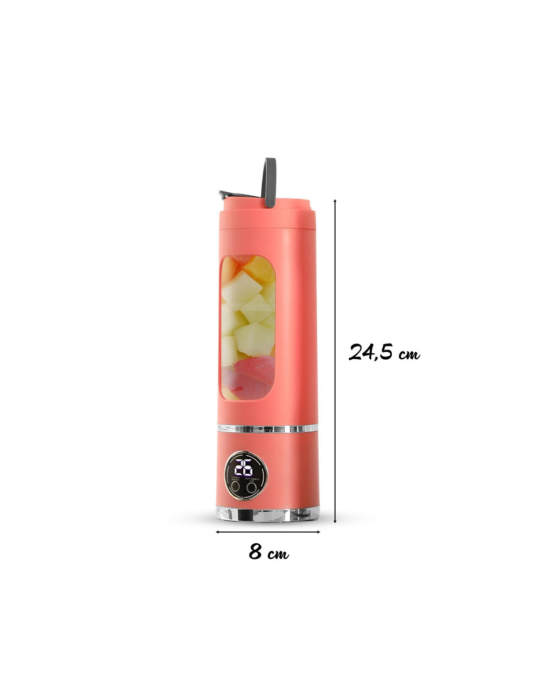 Equipada con una batería integrada recargable vía USB, permite preparar batidos, smoothies, bebidas proteicas o zumos frescos en pocos segundos, sin necesidad de una toma de corriente. La pantalla digital LED permite un uso intuitivo y preciso, mientras que las cuchillas de acero inoxidable garantizan una mezcla uniforme y eficaz.