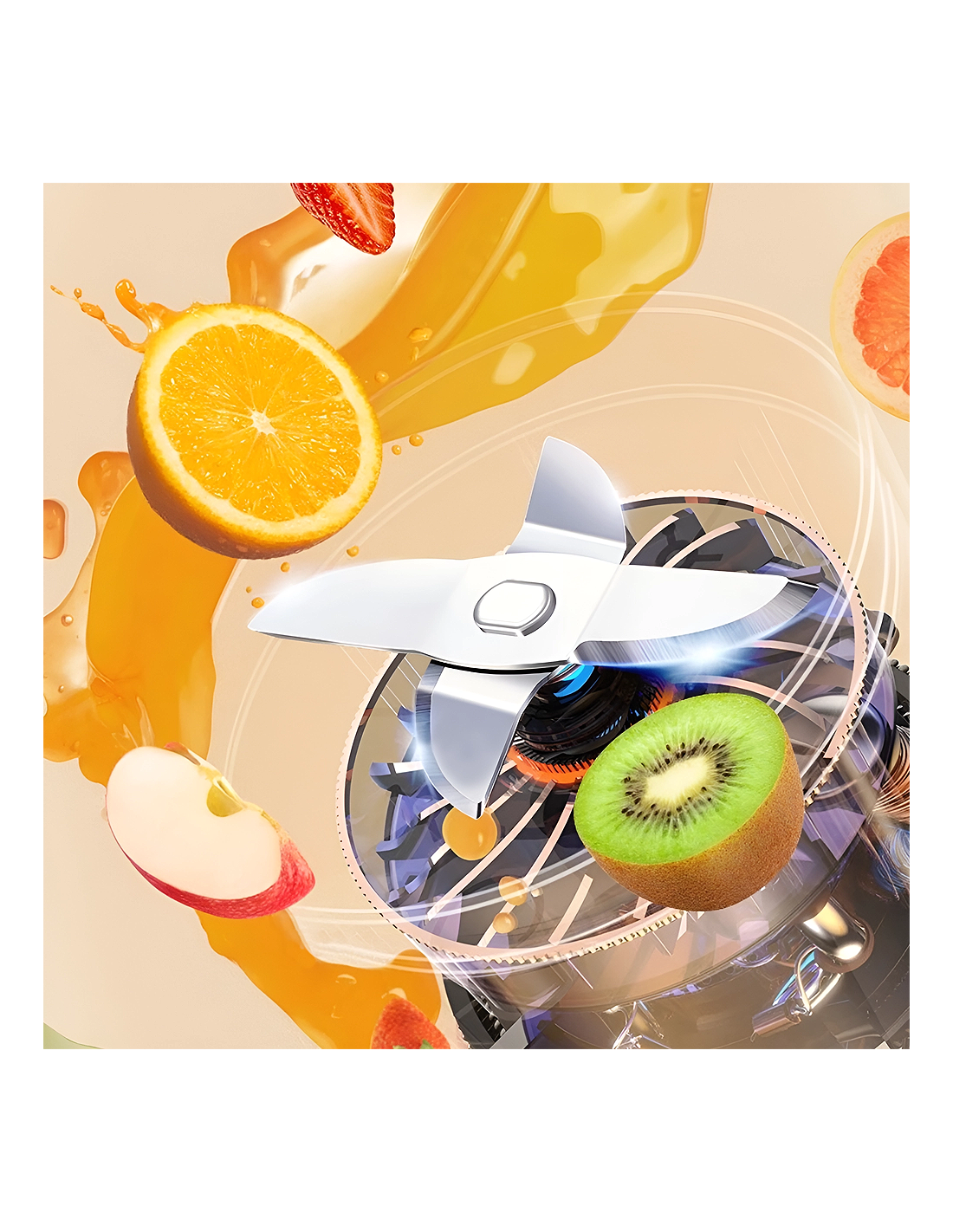 Potente batidora, con motor de 40W y 3 cuchillas de acero. El uso es realmente simple: solo corte la fruta, cierre la tapa e incline la botella en diagonal, luego puede hacer doble clic en el interruptor, ubicado en el lado inferior, y la licuadora comenzará su trabajo, en 20-30 segundos tener un buen batido para disfrutar. Puede verter el contenido en una taza o beber directamente de la botella.