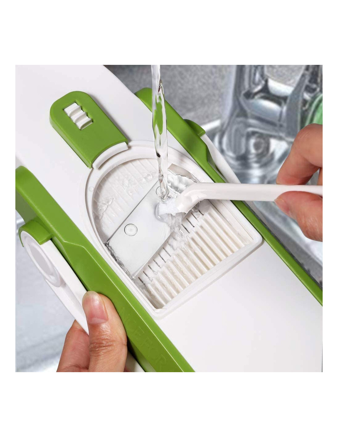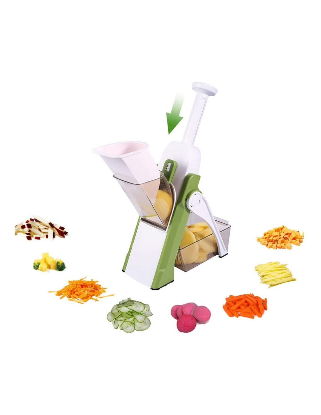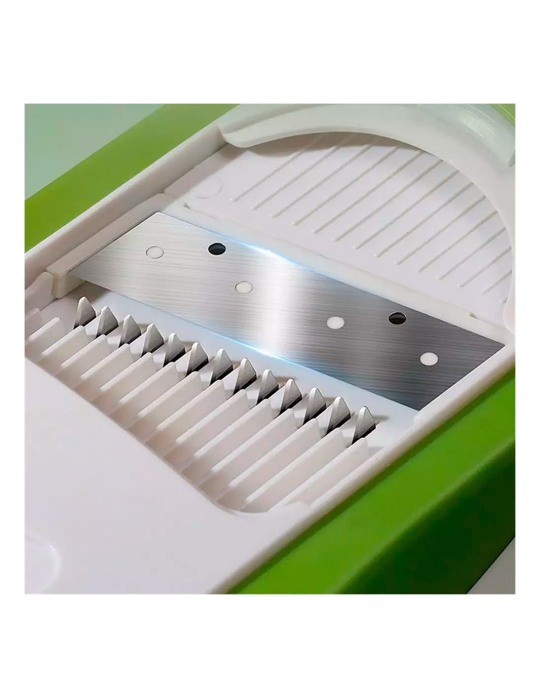Si te encanta preparar y cocinar platos como un auténtico chef, no puedes dejar de tener un cortador de verduras entre tus utensilios de cocina. Con esta herramienta podrás cortar las verduras en: cubos, juliana, palitos, rodajas y muchos otros cortes. Es fácil de usar, puede preparar rápidamente papas, zanahorias, pepinos, pero también frutas como: manzanas, peras, plátanos. En la parte trasera hay un pomo para cortar en juliana y un pomo para elegir el grosor del corte, de 5 a 8 mm. Además, gracias al mecanismo intuitivo, simplemente presione el mango con resorte para cortar en segundos. Las cuchillas están hechas de acero inoxidable y están colocadas para proteger sus manos. Las verduras, una vez cortadas, acaban directamente en la bandeja correspondiente. Una vez que se completa el trabajo, puede enjuagar la mandolina con agua corriente. Con su diseño compacto, se pliega para un fácil almacenamiento.