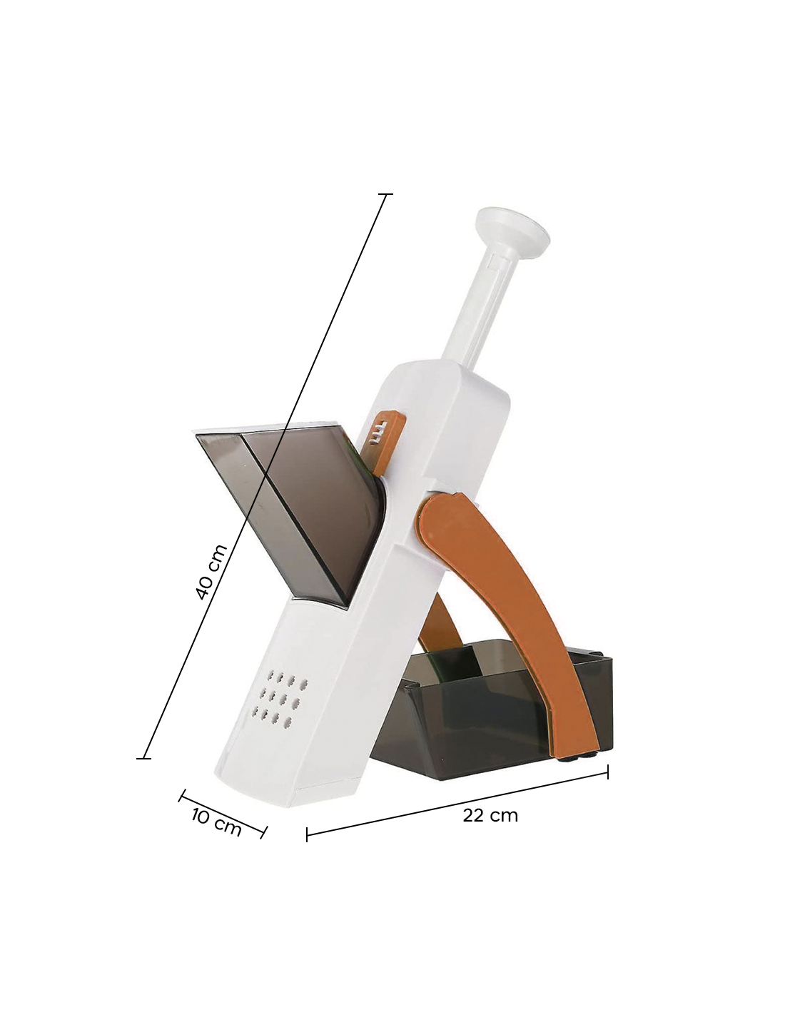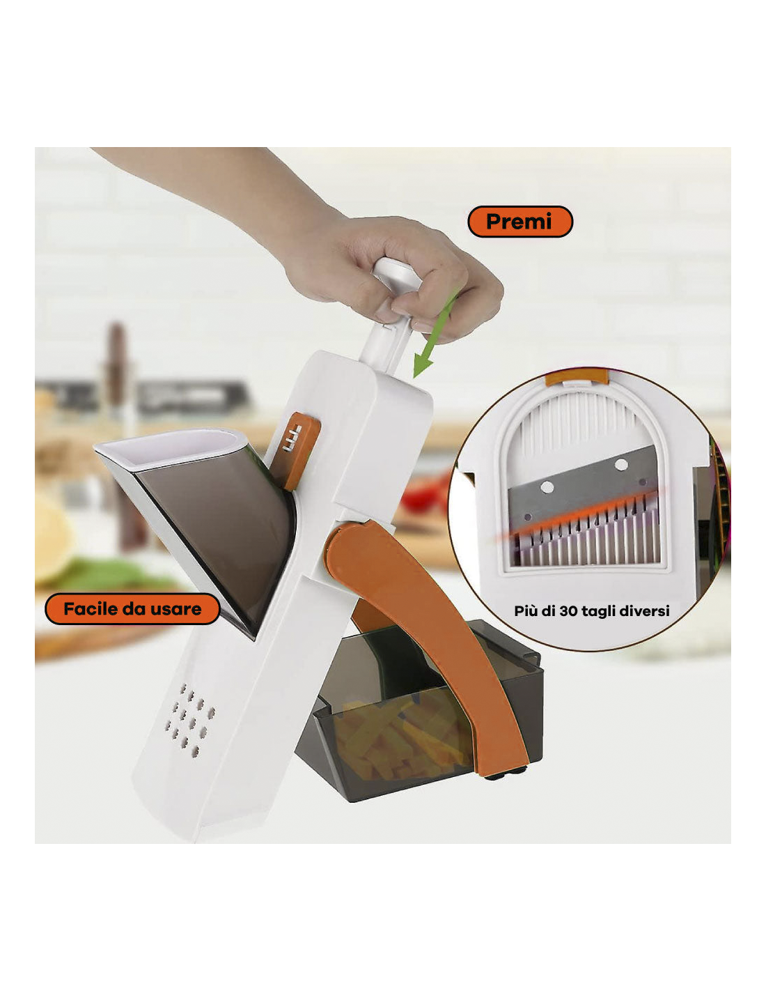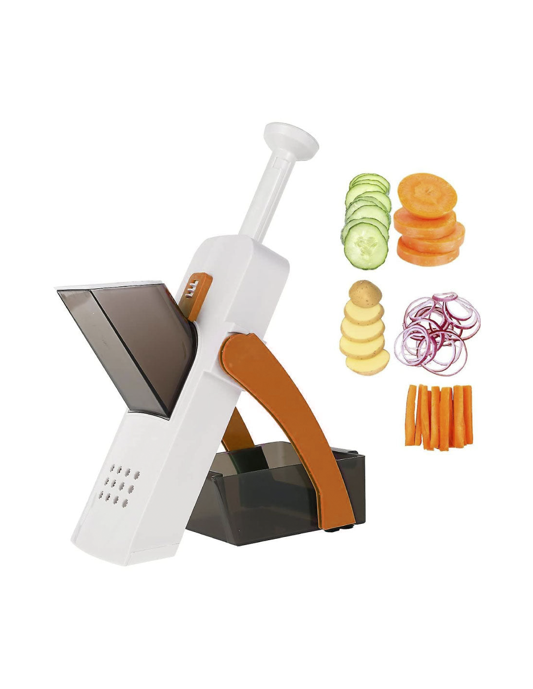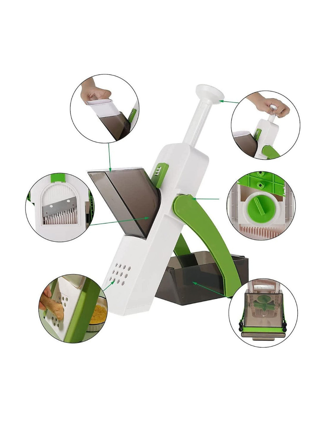 Si te encanta preparar y cocinar platos como un auténtico chef, no puedes dejar de tener un cortador de verduras entre tus utensilios de cocina. Con esta herramienta podrás cortar las verduras en: cubos, juliana, palitos, rodajas y muchos otros cortes. Es fácil de usar, puede preparar rápidamente papas, zanahorias, pepinos, pero también frutas como: manzanas, peras, plátanos. En la parte trasera hay un pomo para cortar en juliana y un pomo para elegir el grosor del corte, de 5 a 8 mm. Además, gracias al mecanismo intuitivo, simplemente presione el mango con resorte para cortar en segundos. Las cuchillas están hechas de acero inoxidable y están colocadas para proteger sus manos. Las verduras, una vez cortadas, acaban directamente en la bandeja correspondiente. Una vez que se completa el trabajo, puede enjuagar la mandolina con agua corriente. Con su diseño compacto, se pliega para un fácil almacenamiento.