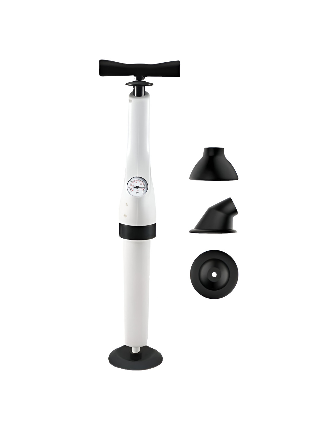 Desatascador de presión con manómetro y pistón inflador para WC y lavabos.